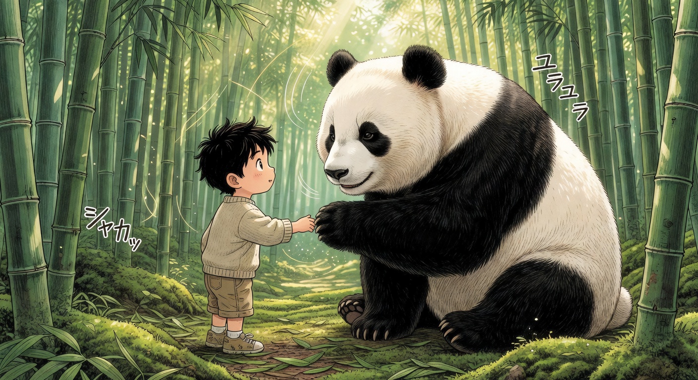 竹林の少年とパンダ